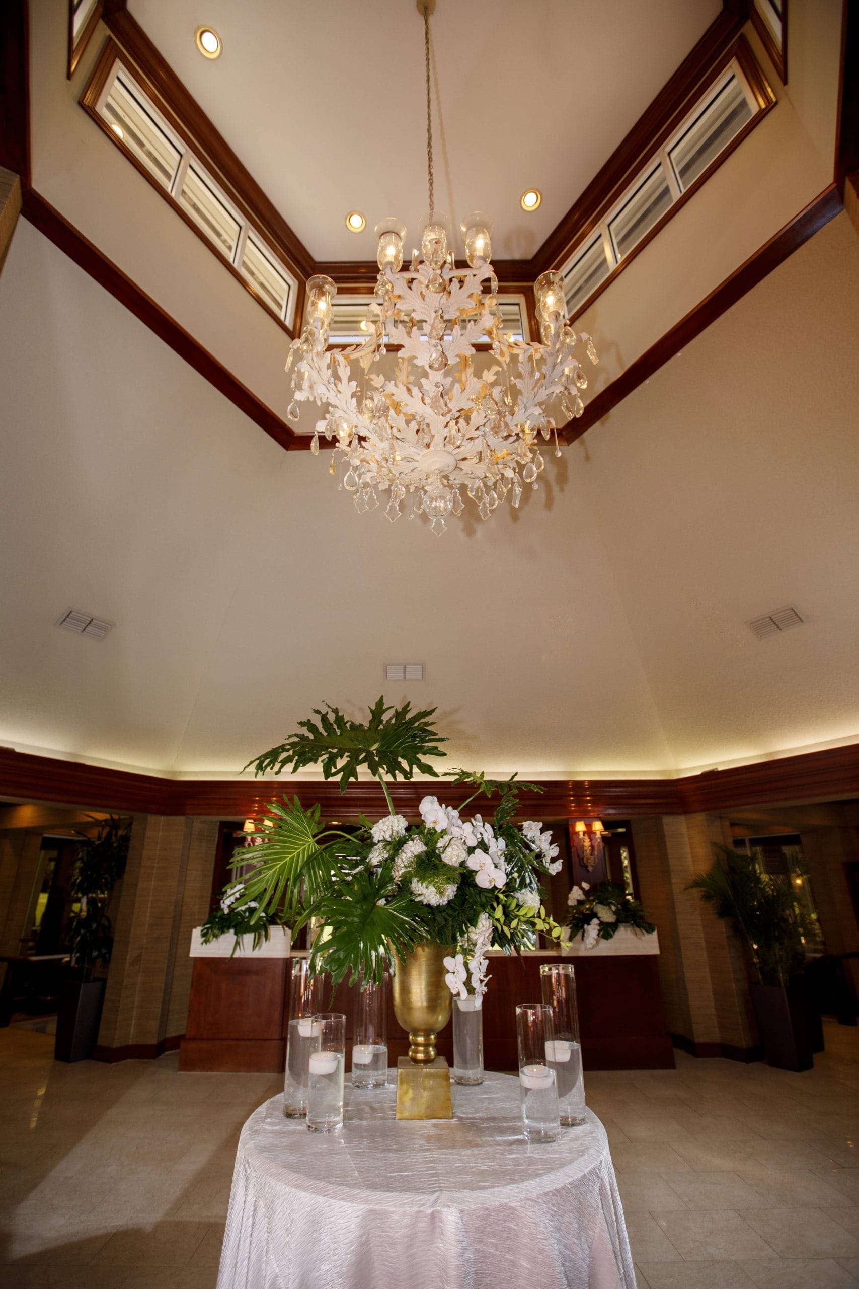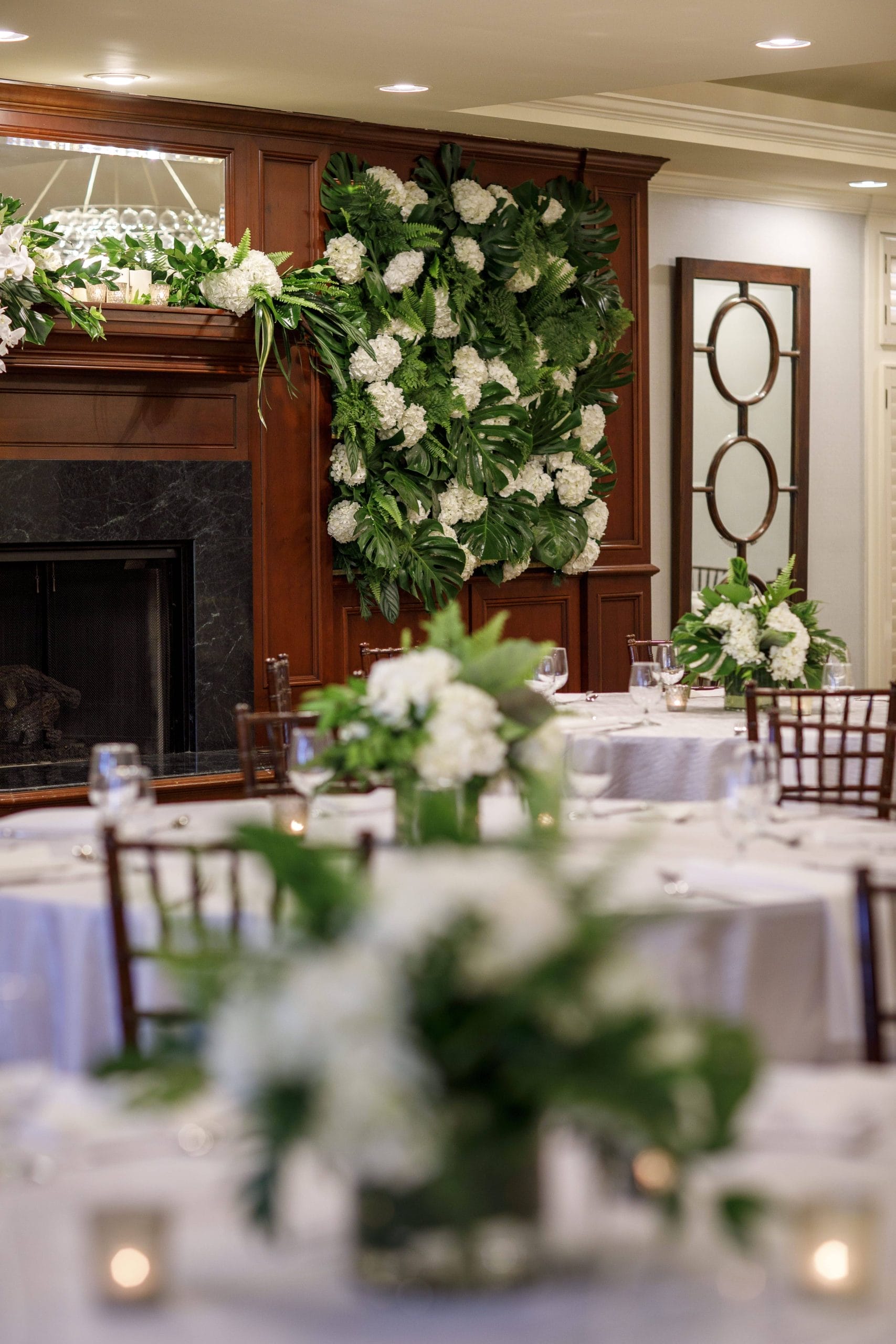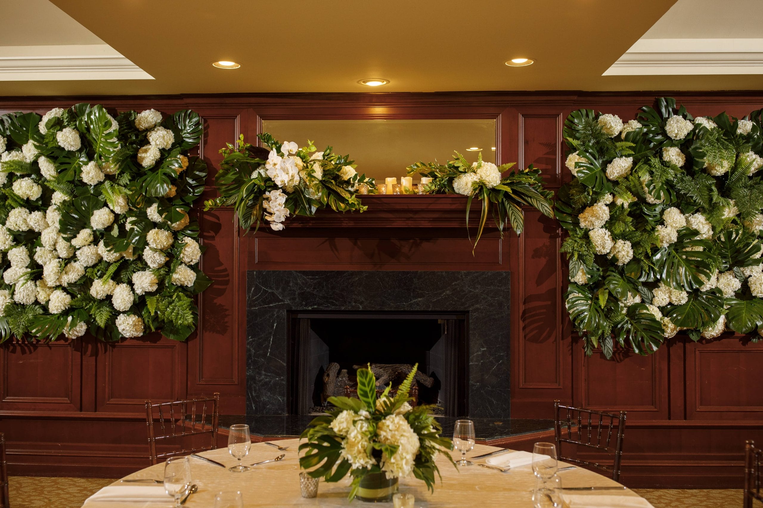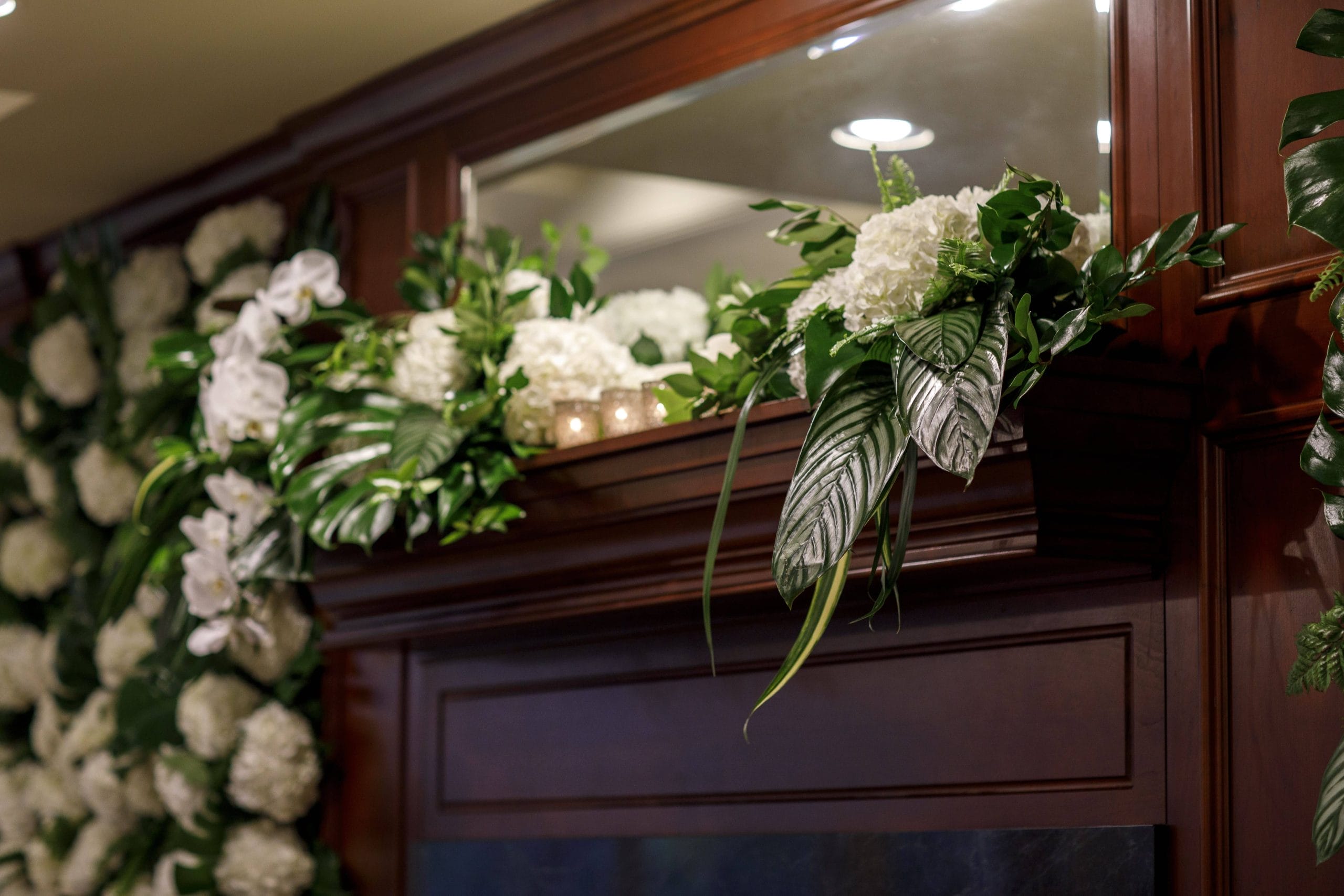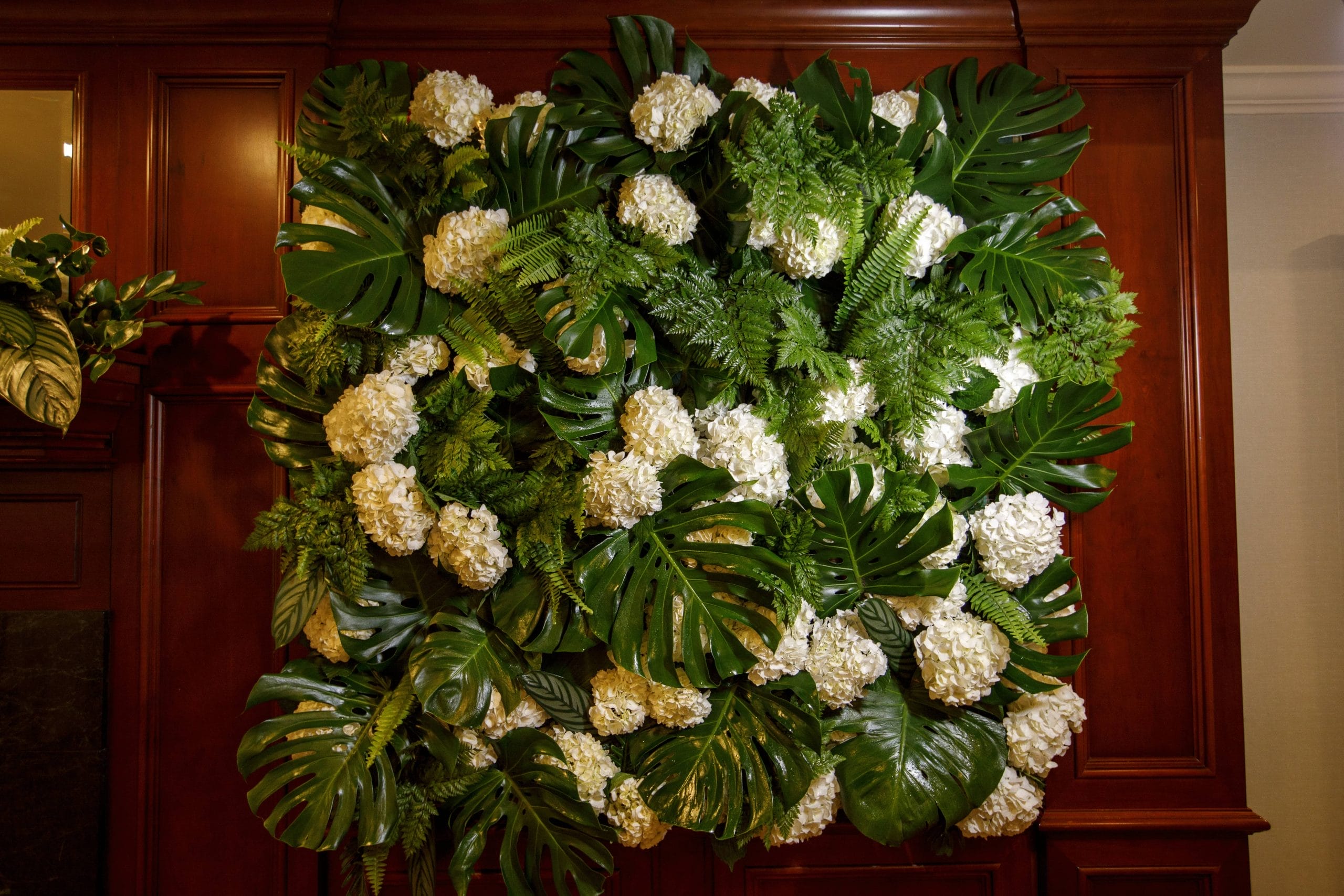 Making a statement! Adding a few statement areas with your decor can leave a lasting impression on your guests. For this lovely event we worked with the family to enhance the entrance area as well as create a floral wall of white hydrangea and tropical greenery (perfect for photo ops!).