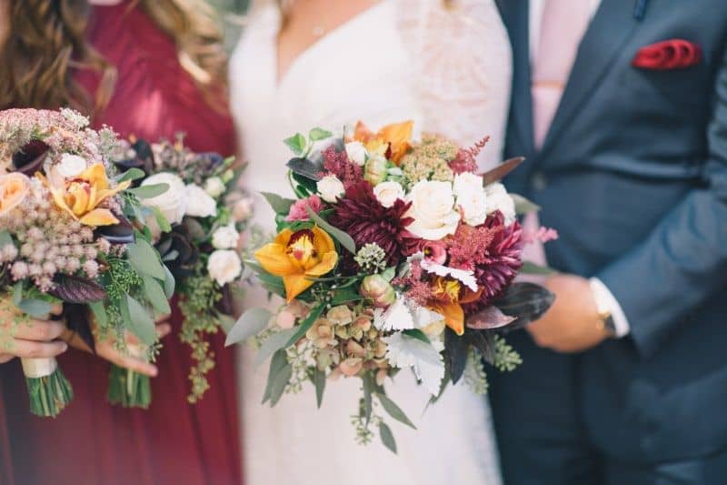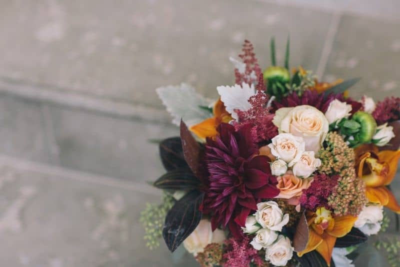 Inspiration comes from many places, when our designer saw the beautiful color scheme of the wedding stationary we knew this would be the theme for the event. Mixing luscious premium blooms in burgundy, red and rust with more muted tones in shades of peach, nude and cameo in earthy textures.