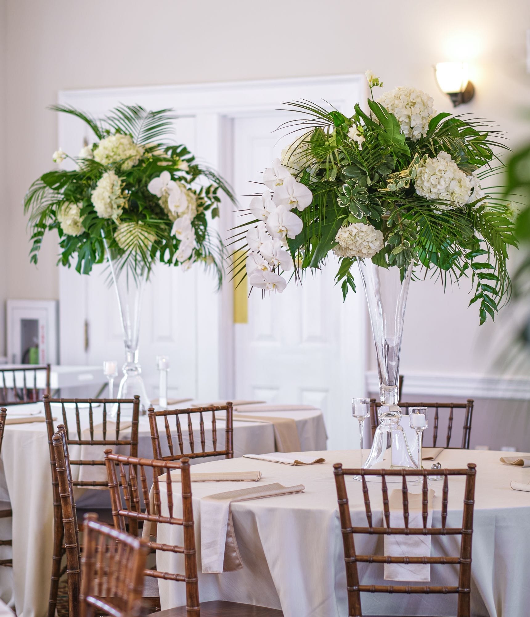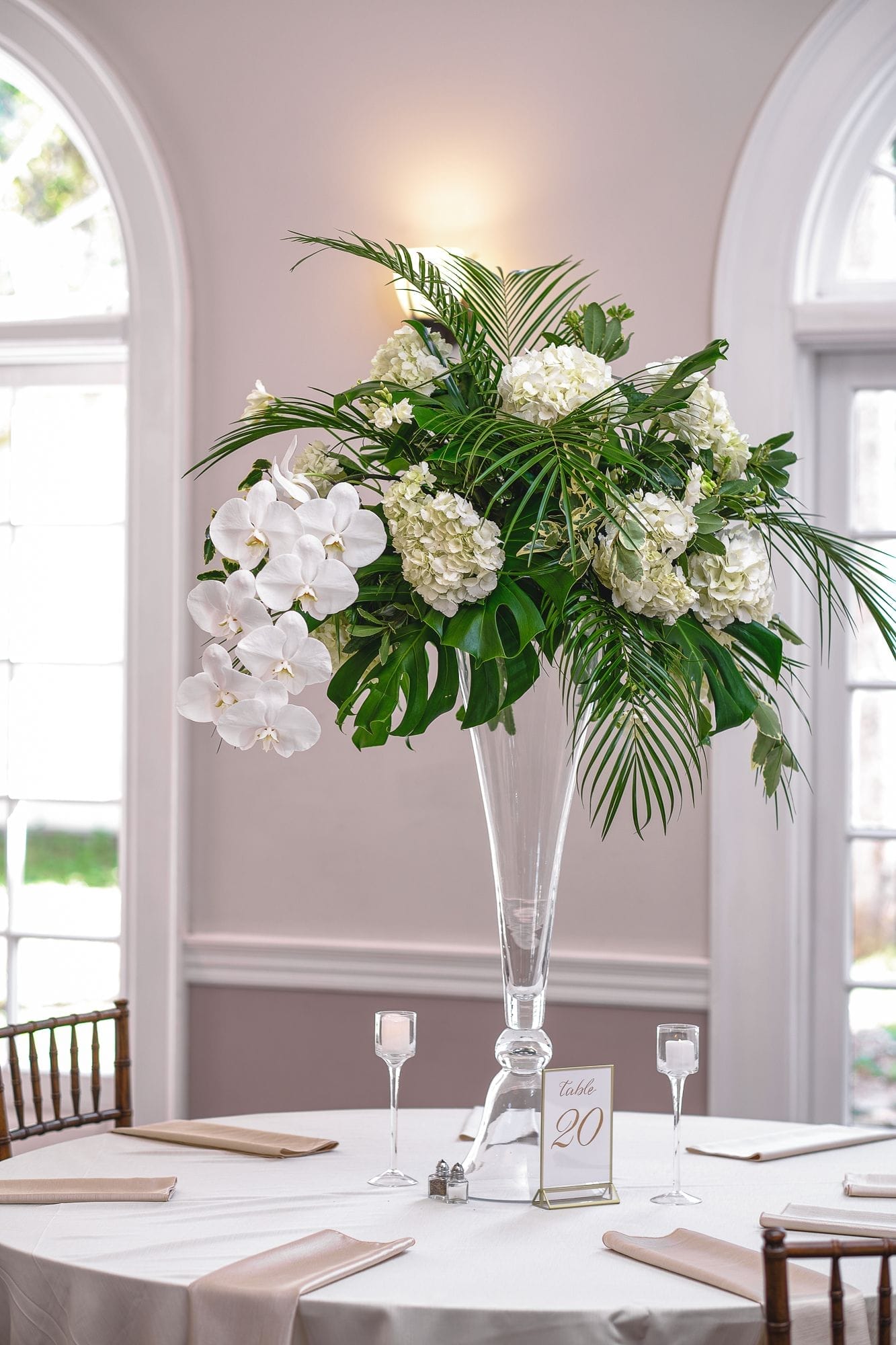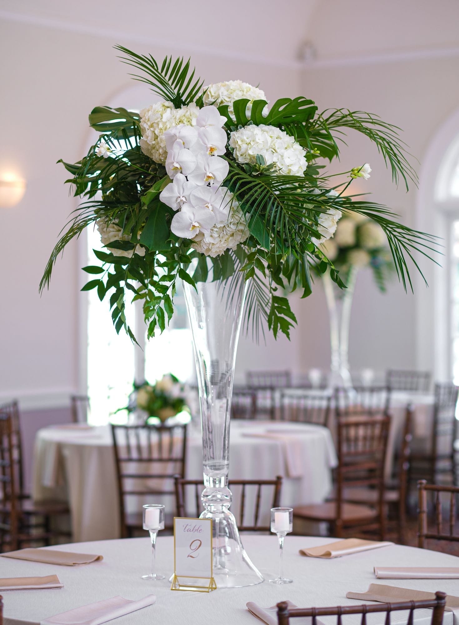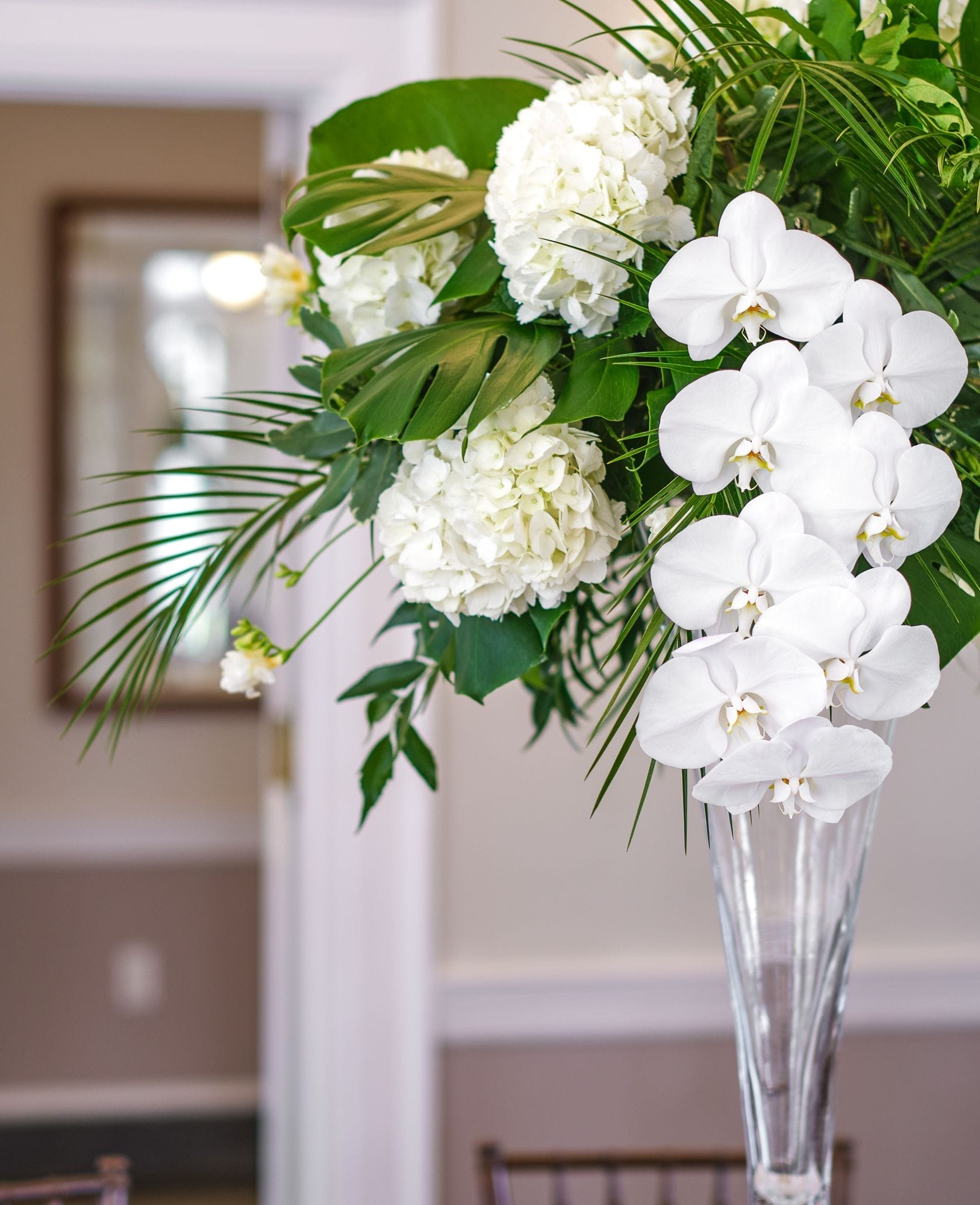 Large white phalaenopsis orchids with large monstera and tropical foliage made for a spectacular reception at the Ribault Club!
