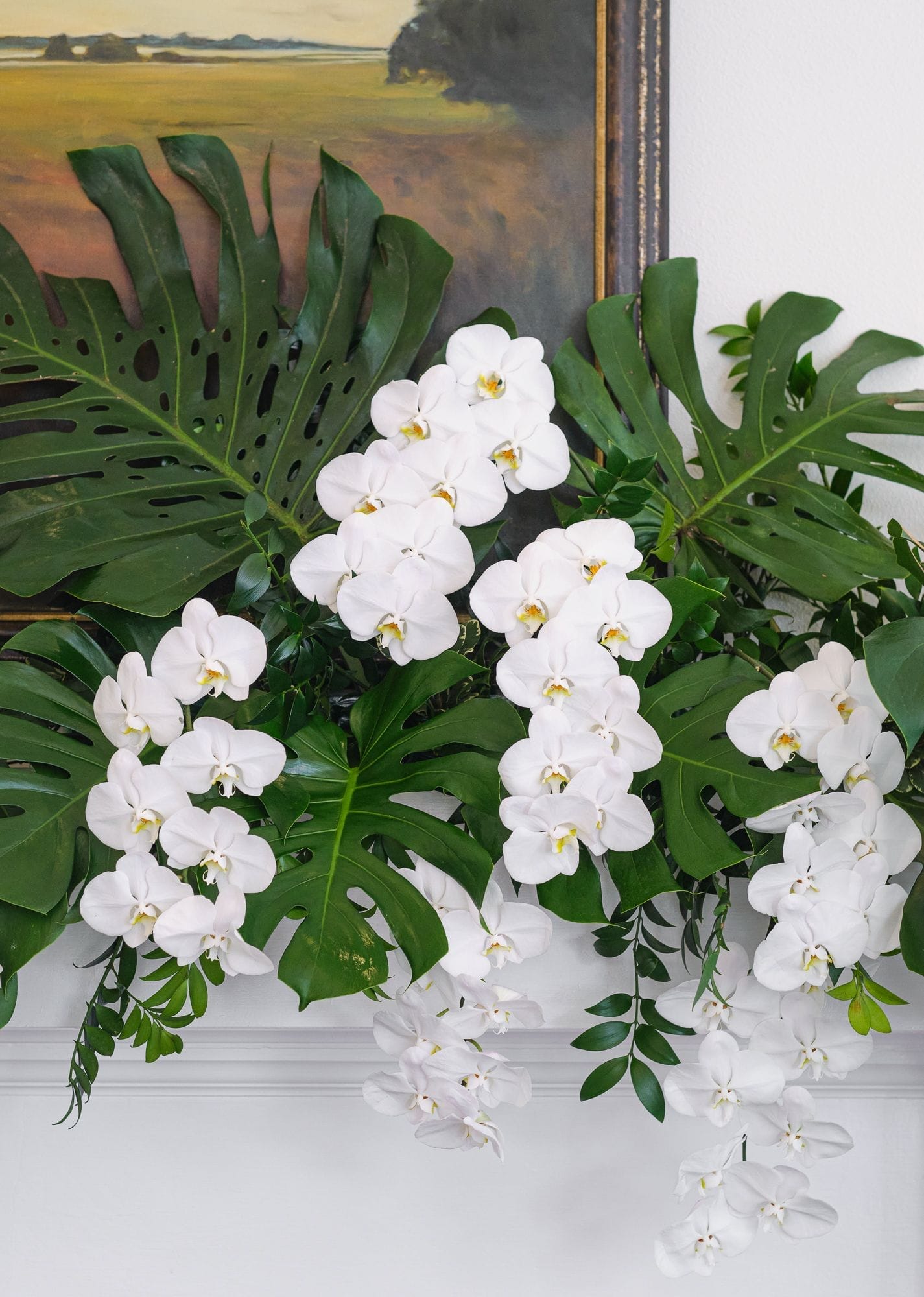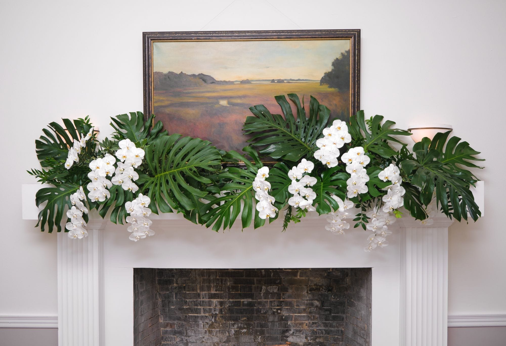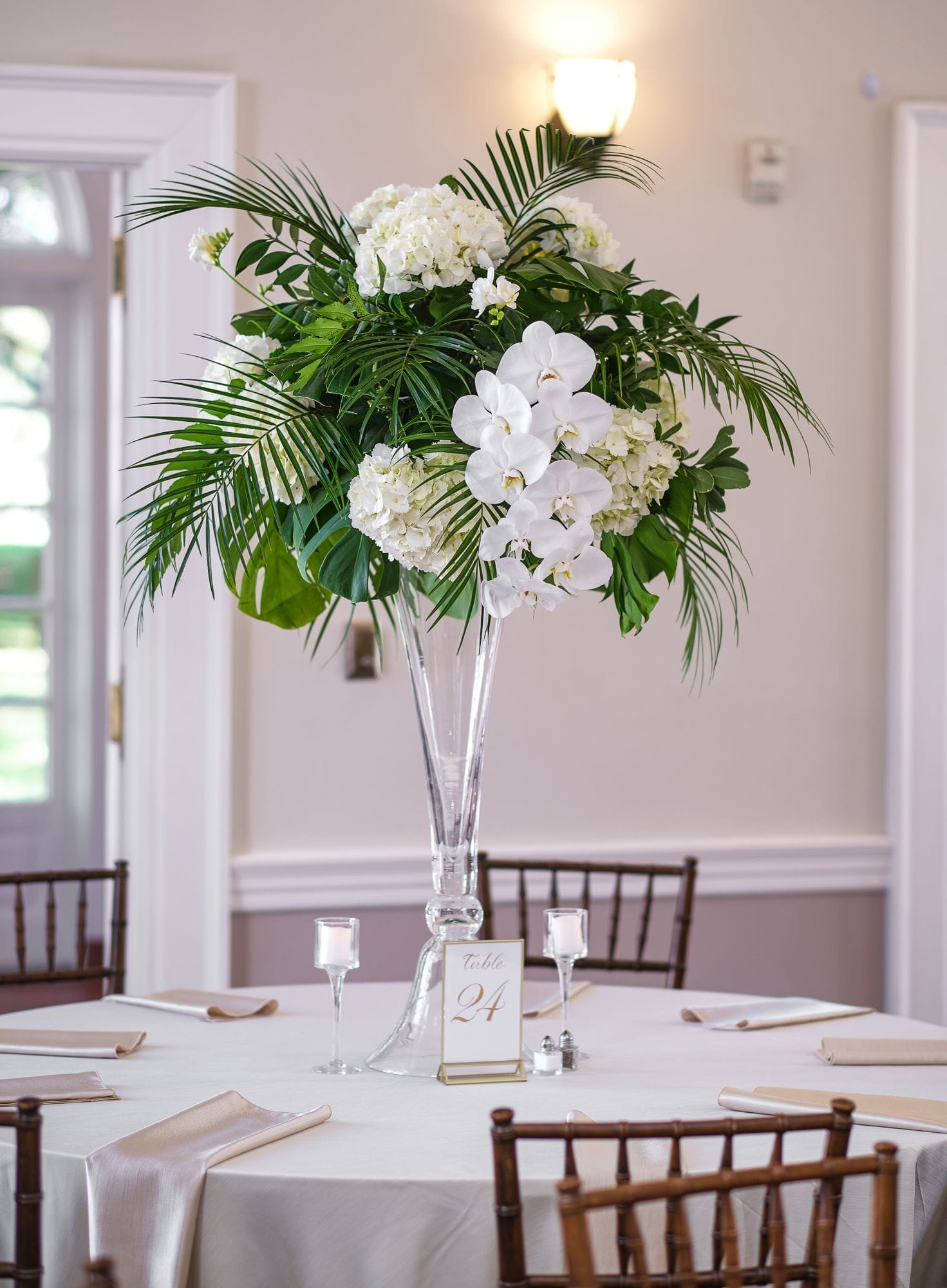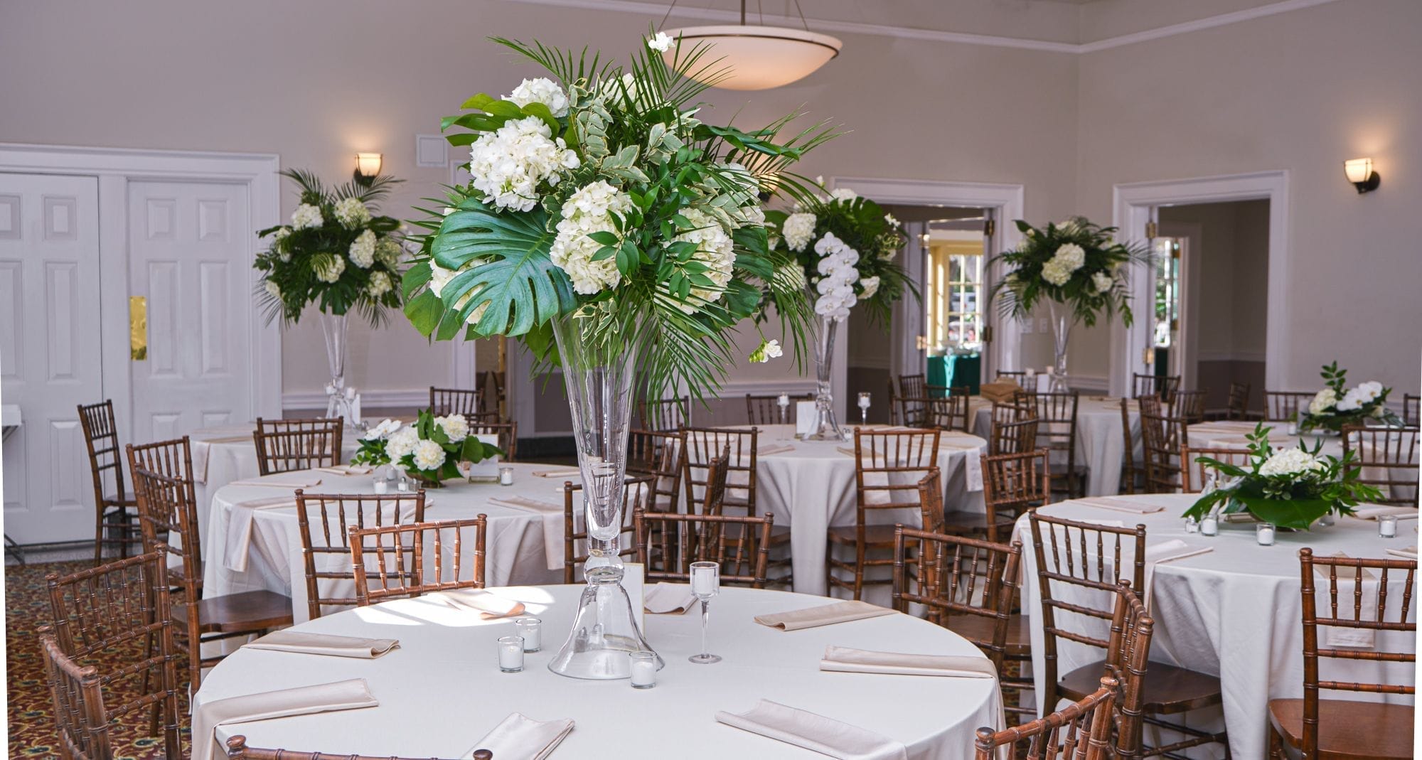 Large white phalaenopsis orchids with large monstera and tropical foliage made for a spectacular reception at the Ribault Club!