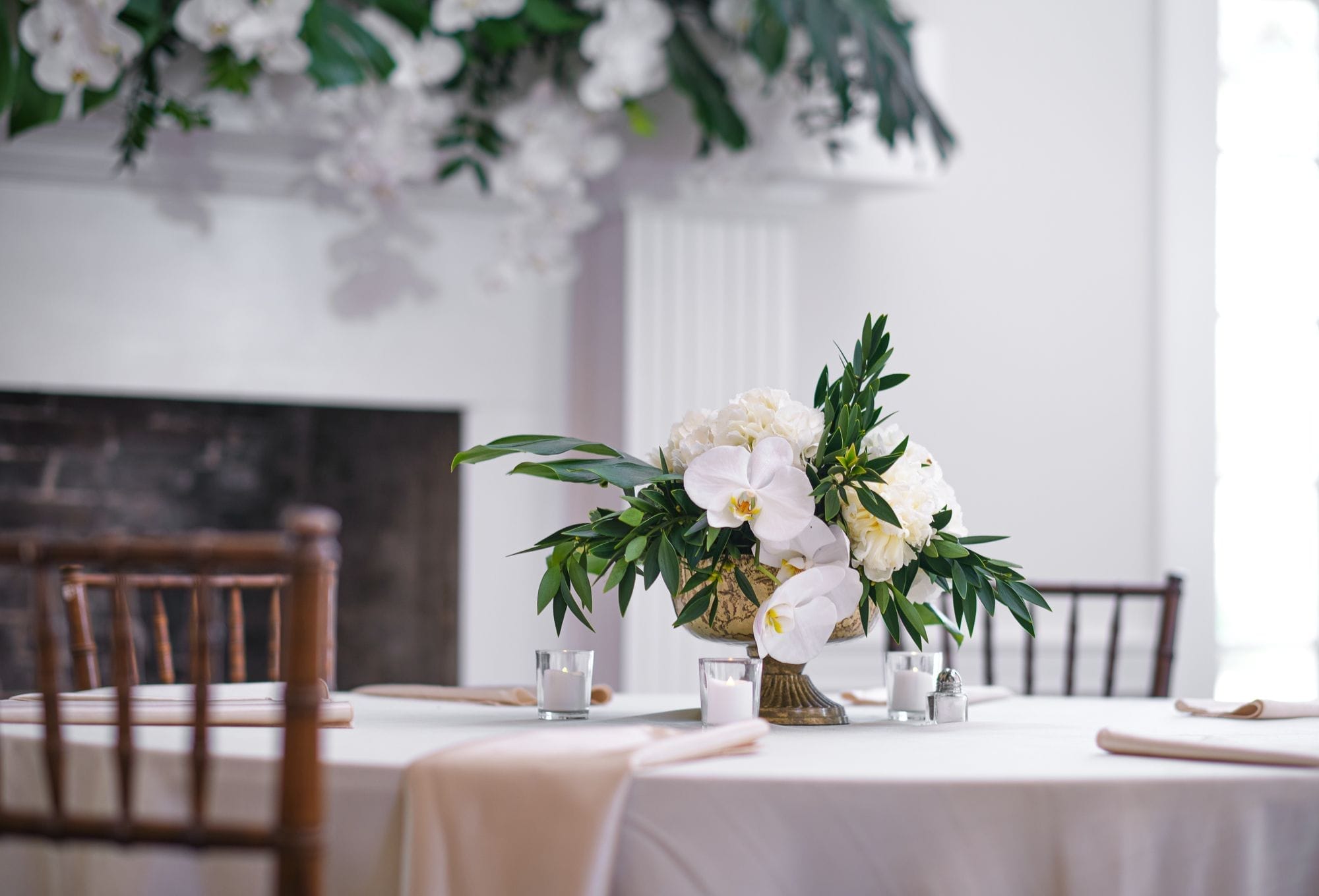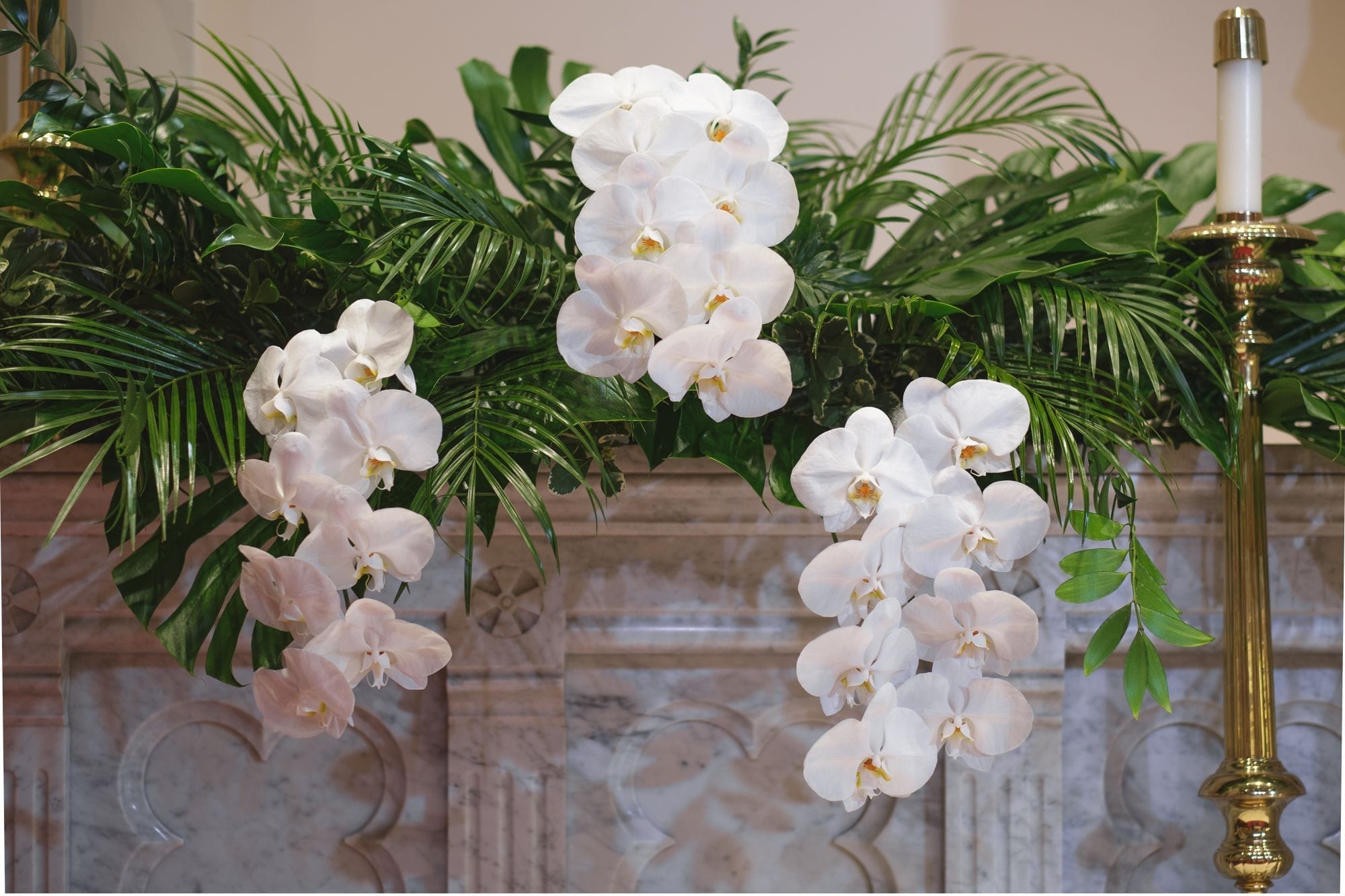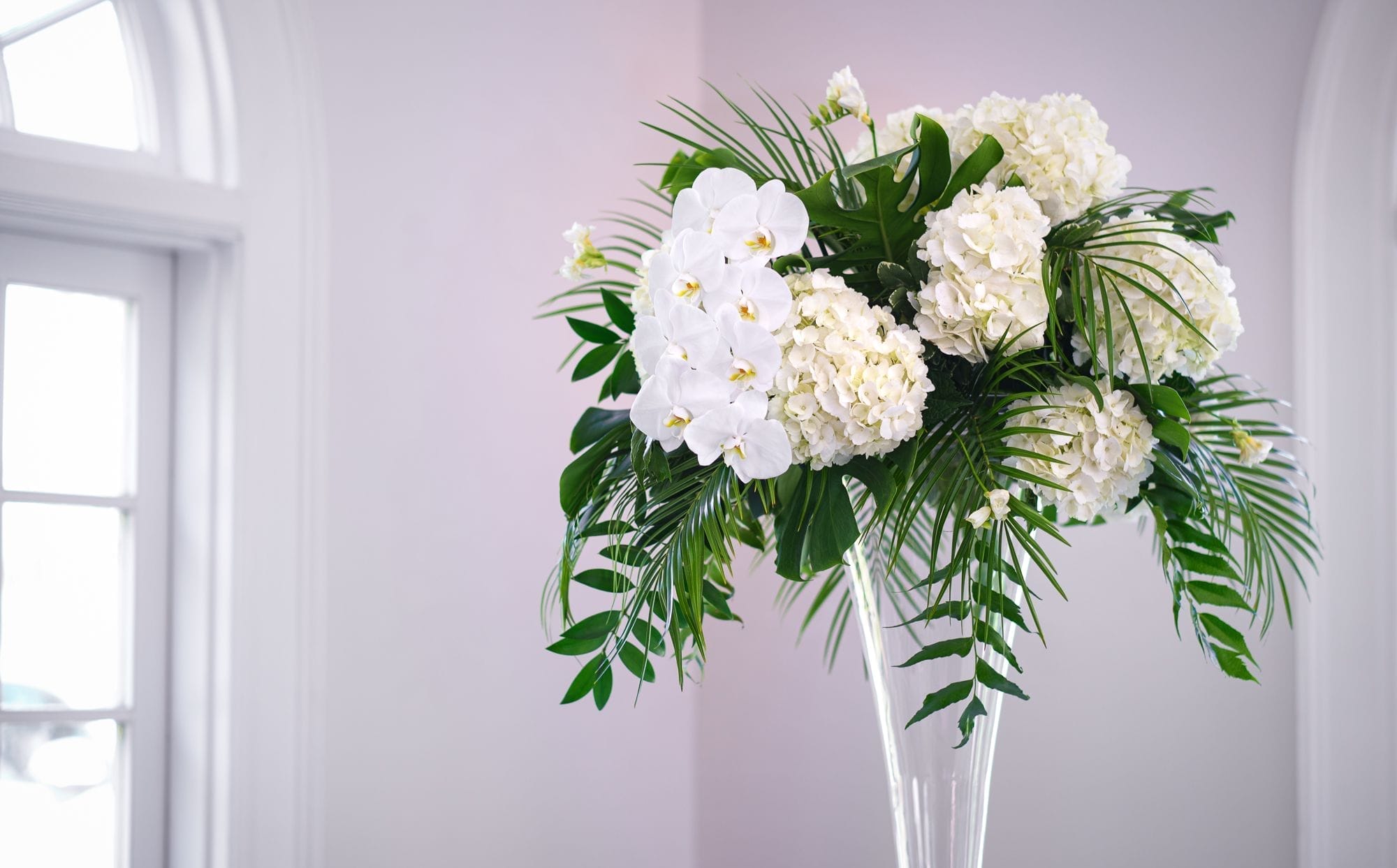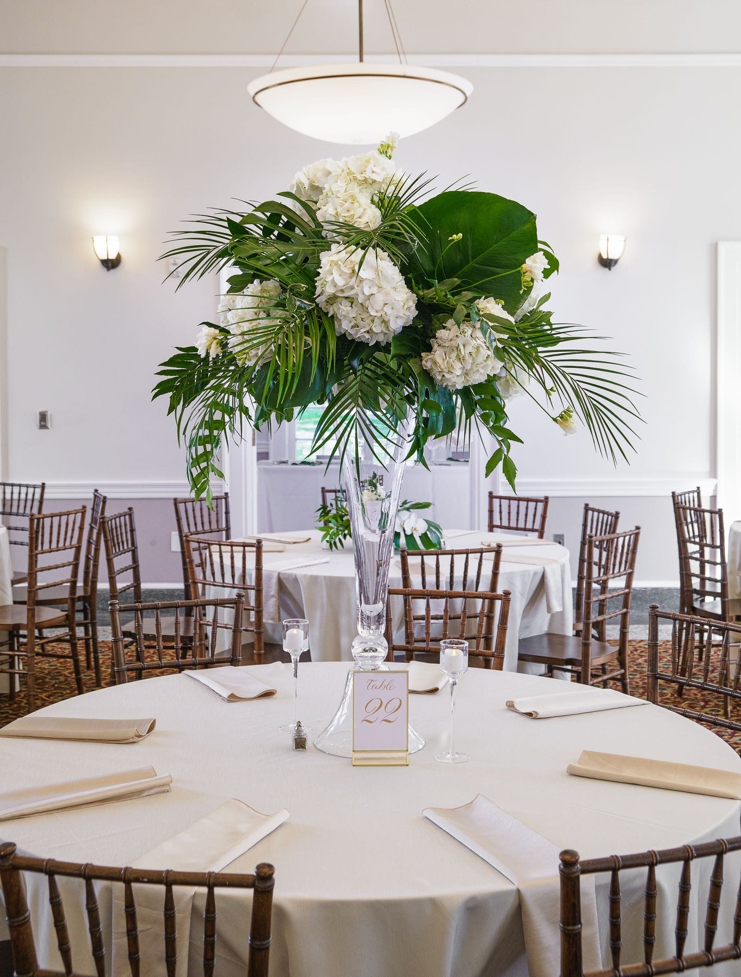 Large white phalaenopsis orchids with large monstera and tropical foliage made for a spectacular reception at the Ribault Club!