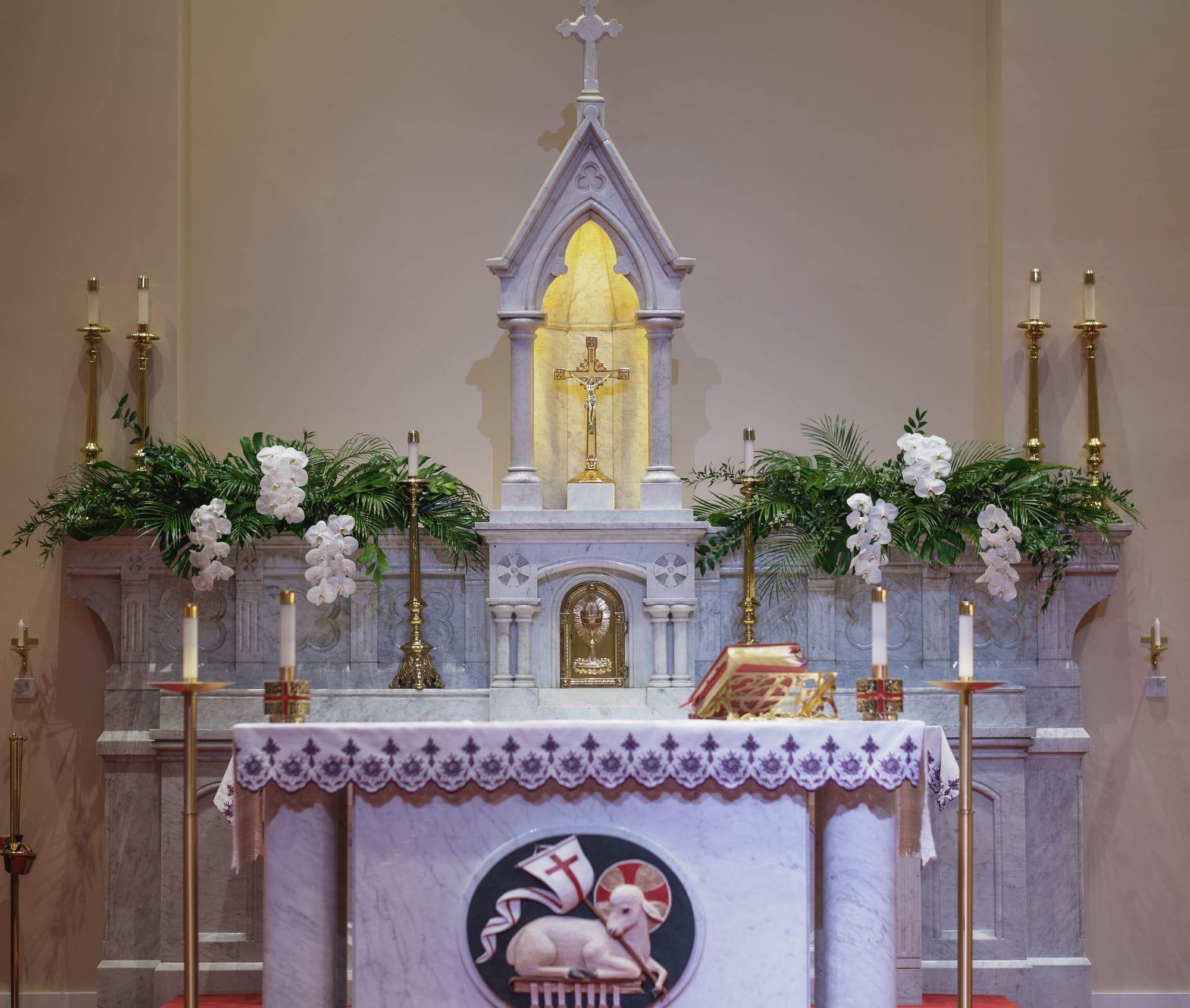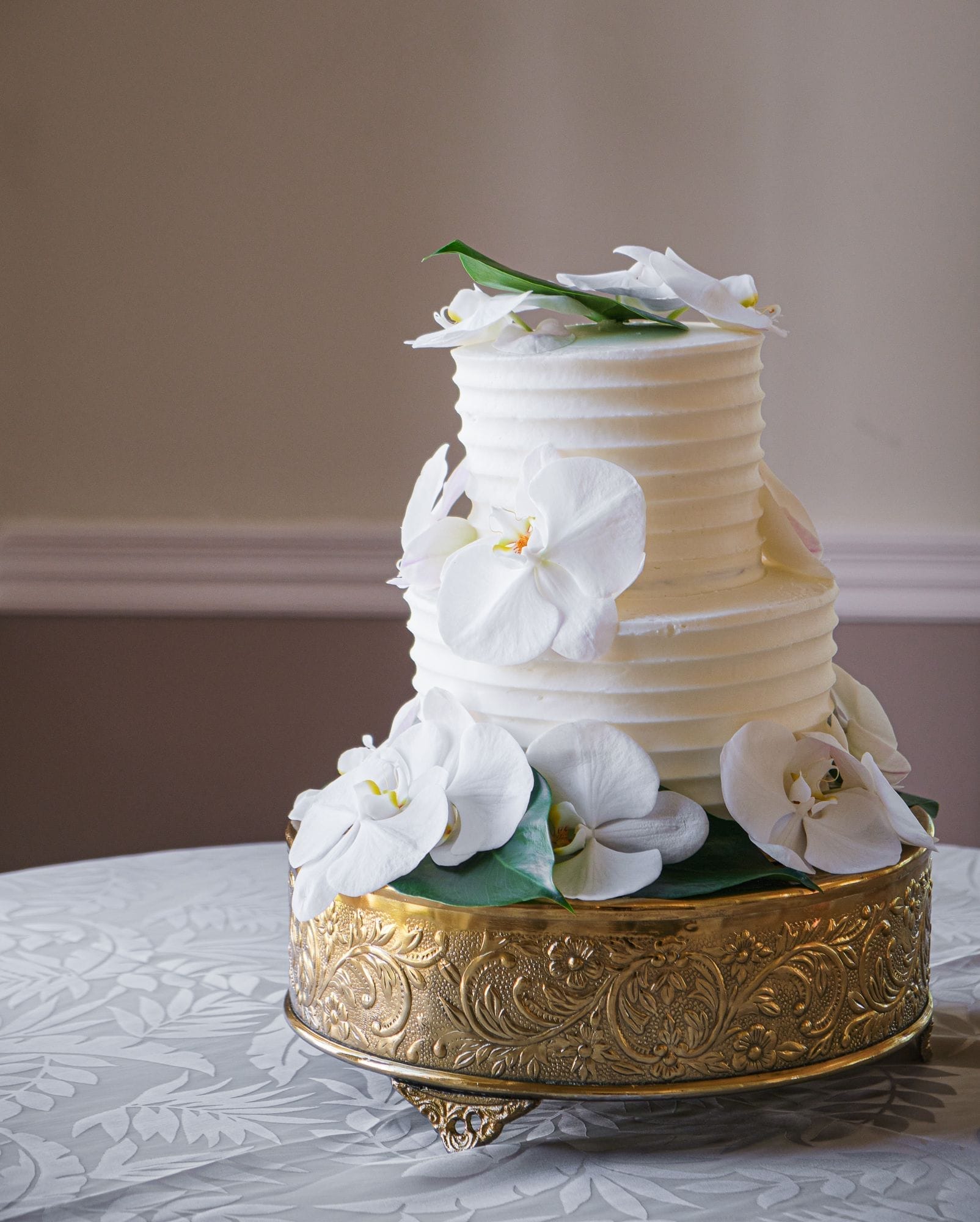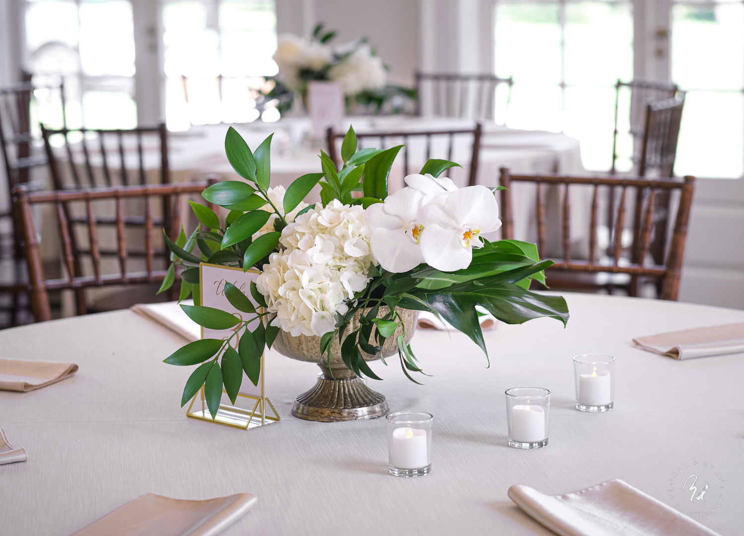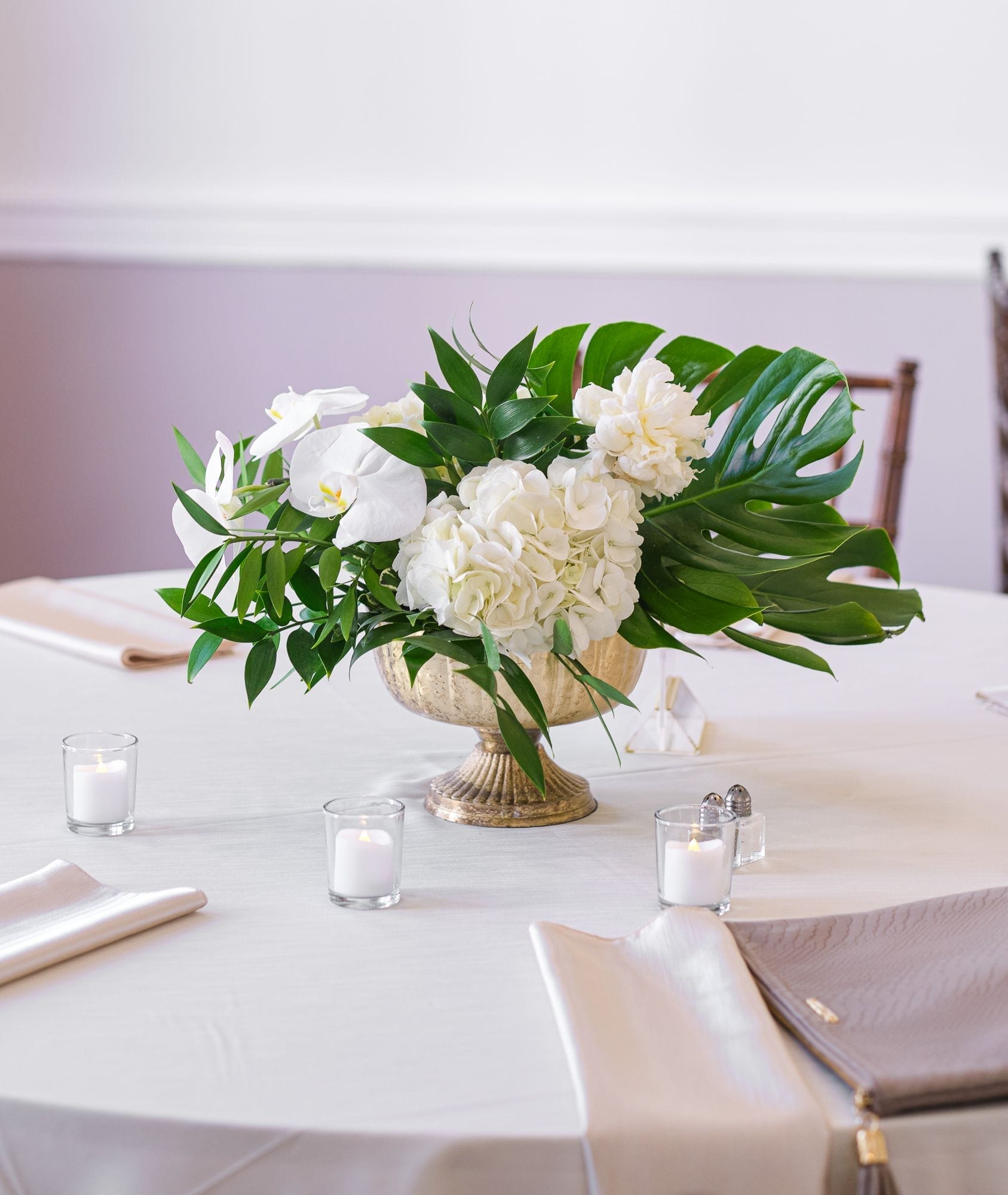 Large white phalaenopsis orchids with large monstera and tropical foliage made for a spectacular reception at the Ribault Club!