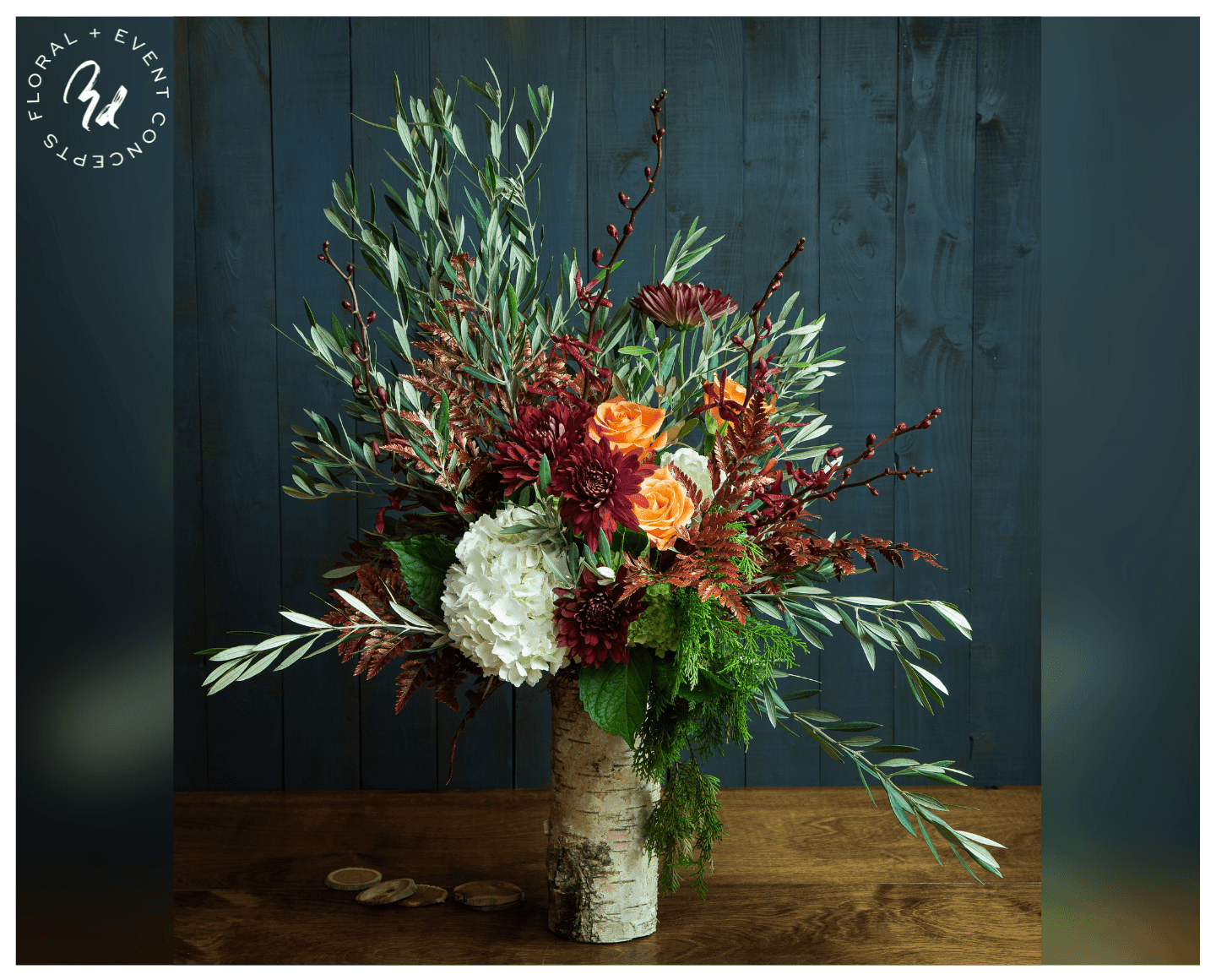Burgundy mums, burgundy James Story and Mokara orchids, olive branches, orange roses, arborvitae, copper leatherleaf and white hydrangea. Approximately 32” Tall x 26” Wide