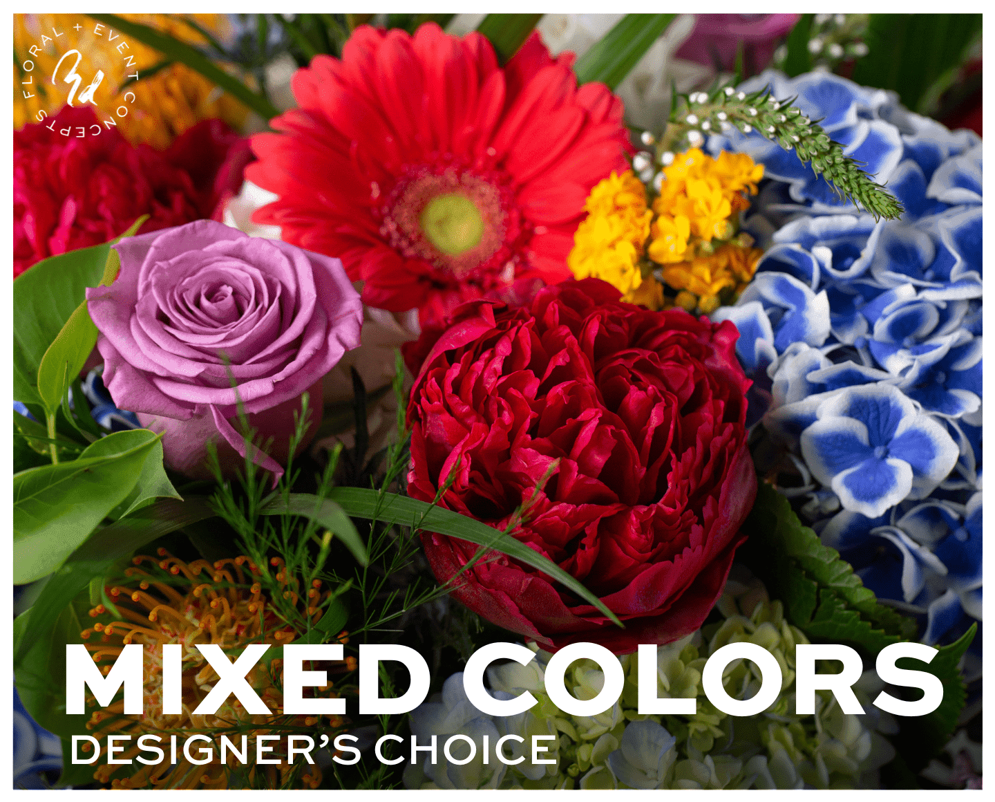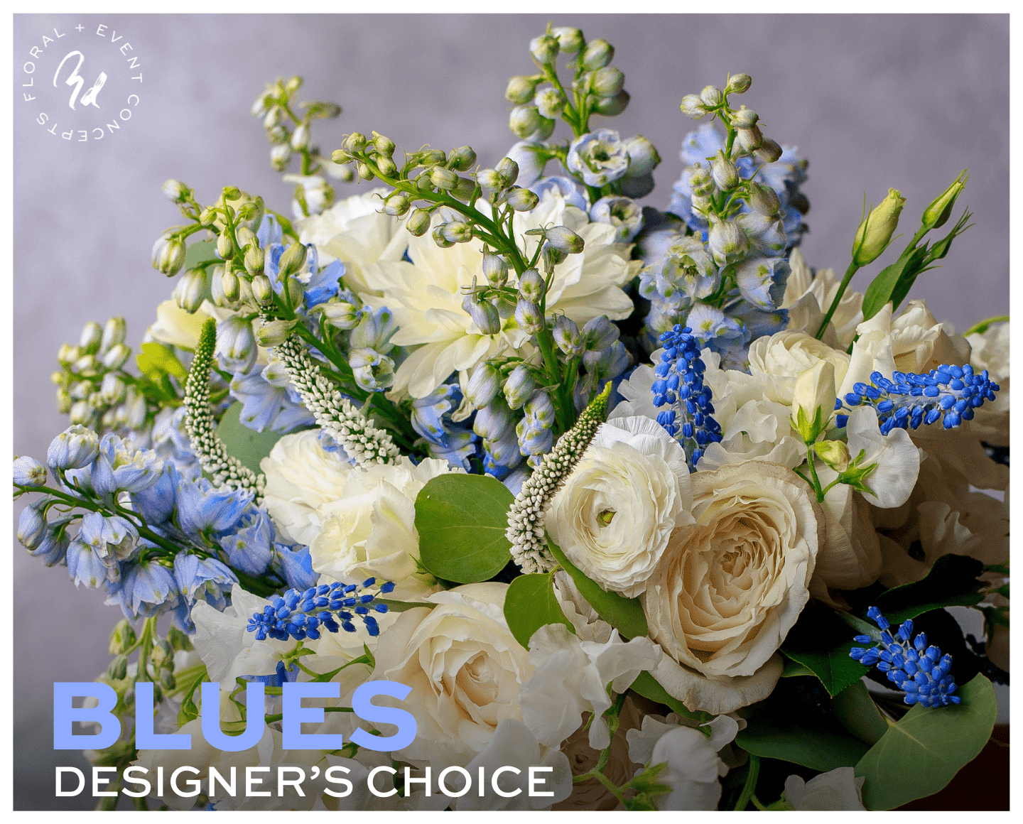 Let our designers choose from a variety of the most inspirational blooms in all shades of blue to create something one-of-a-kind! No particular varieties guaranteed, design styles will vary.