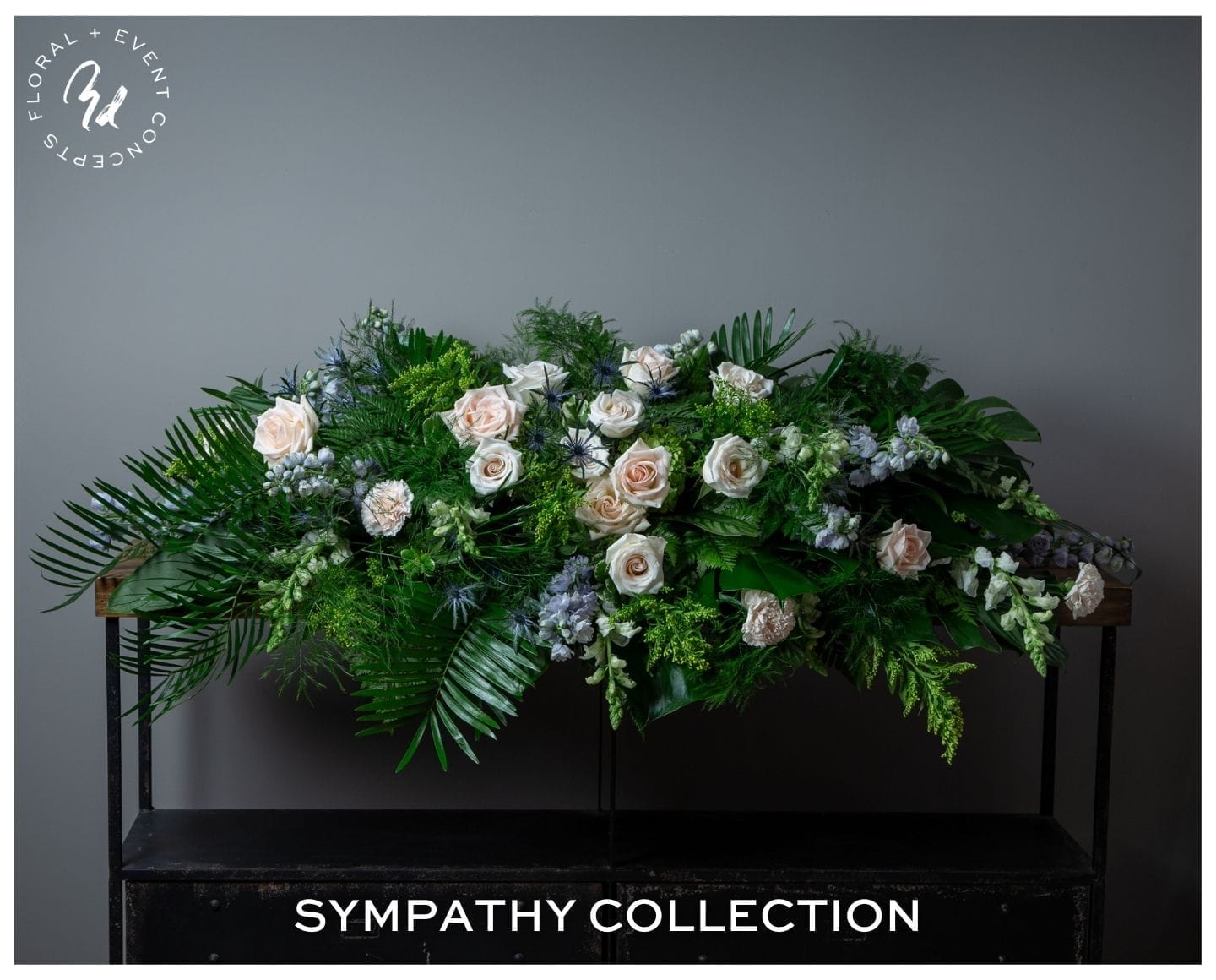 Garden style casket cover arrangement designed to adorn the length of a half open or closed casket. Featuring flowers like roses, hydrangea, snapdragons, and delphinium with a variety of textured foliage. Different color options available. Approximately 13” Tall x 58” Wide