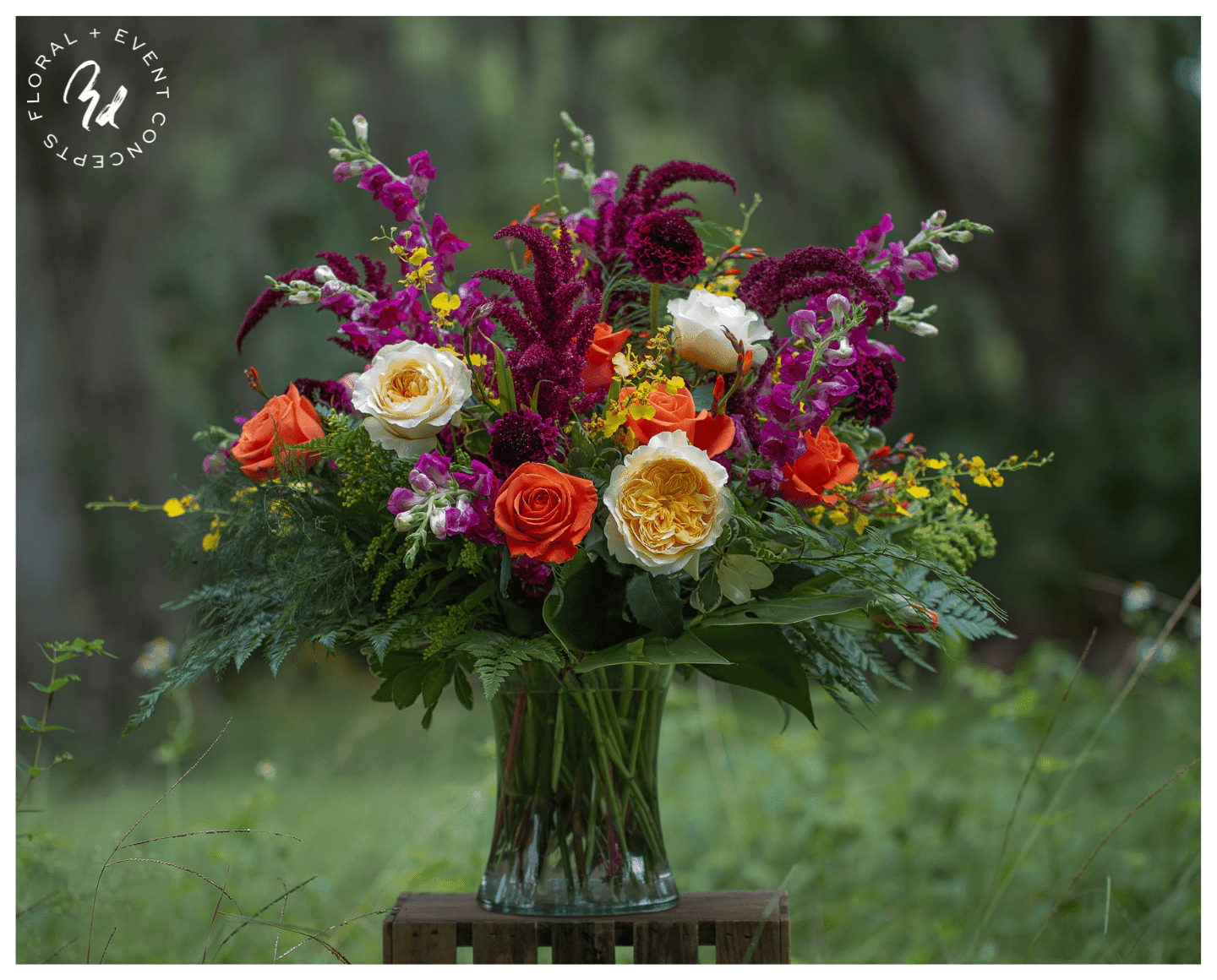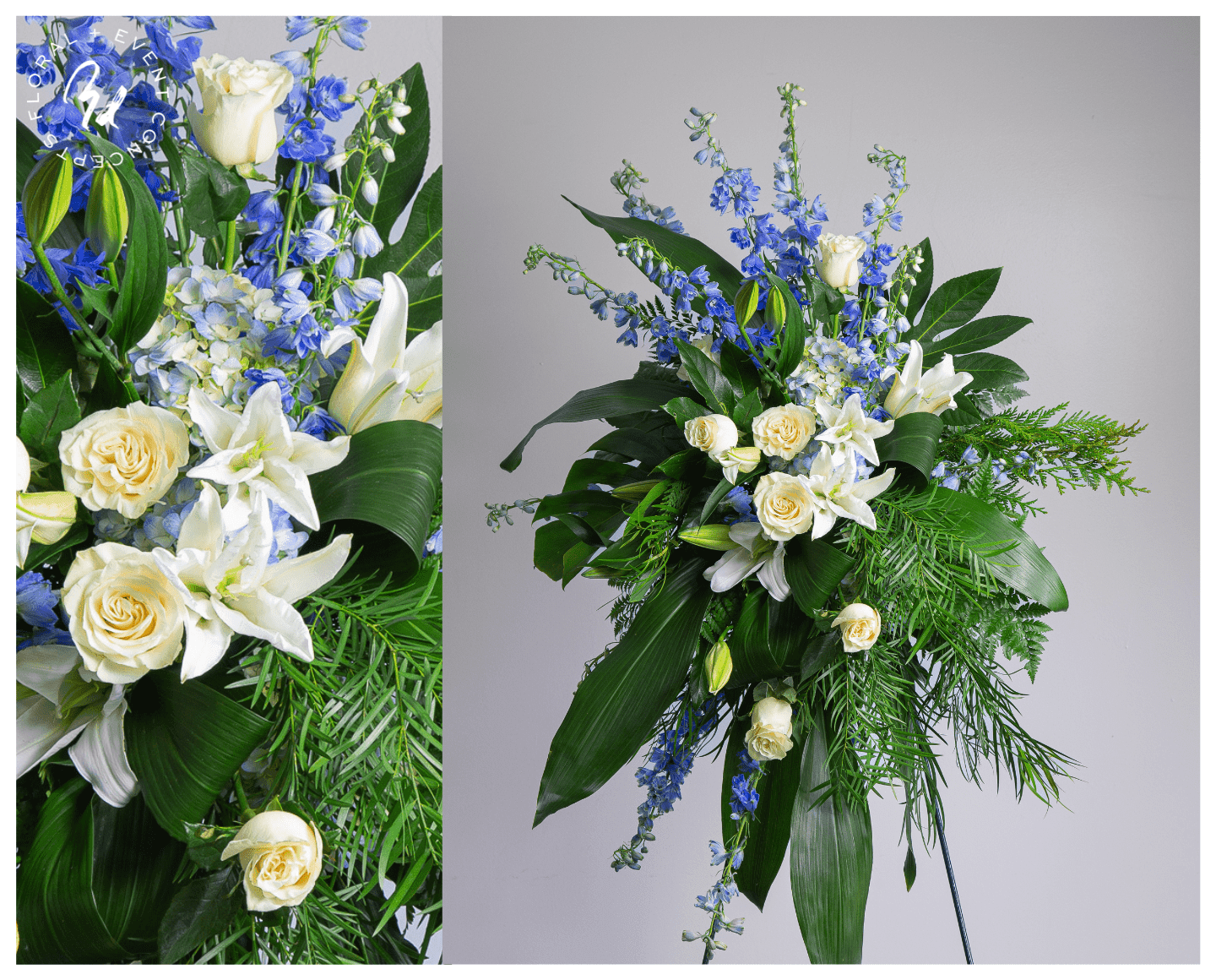 This standing spray highlights the best selection of blue delphinium, white roses and white lilies. Approximately 38″ tall x 30″ wide